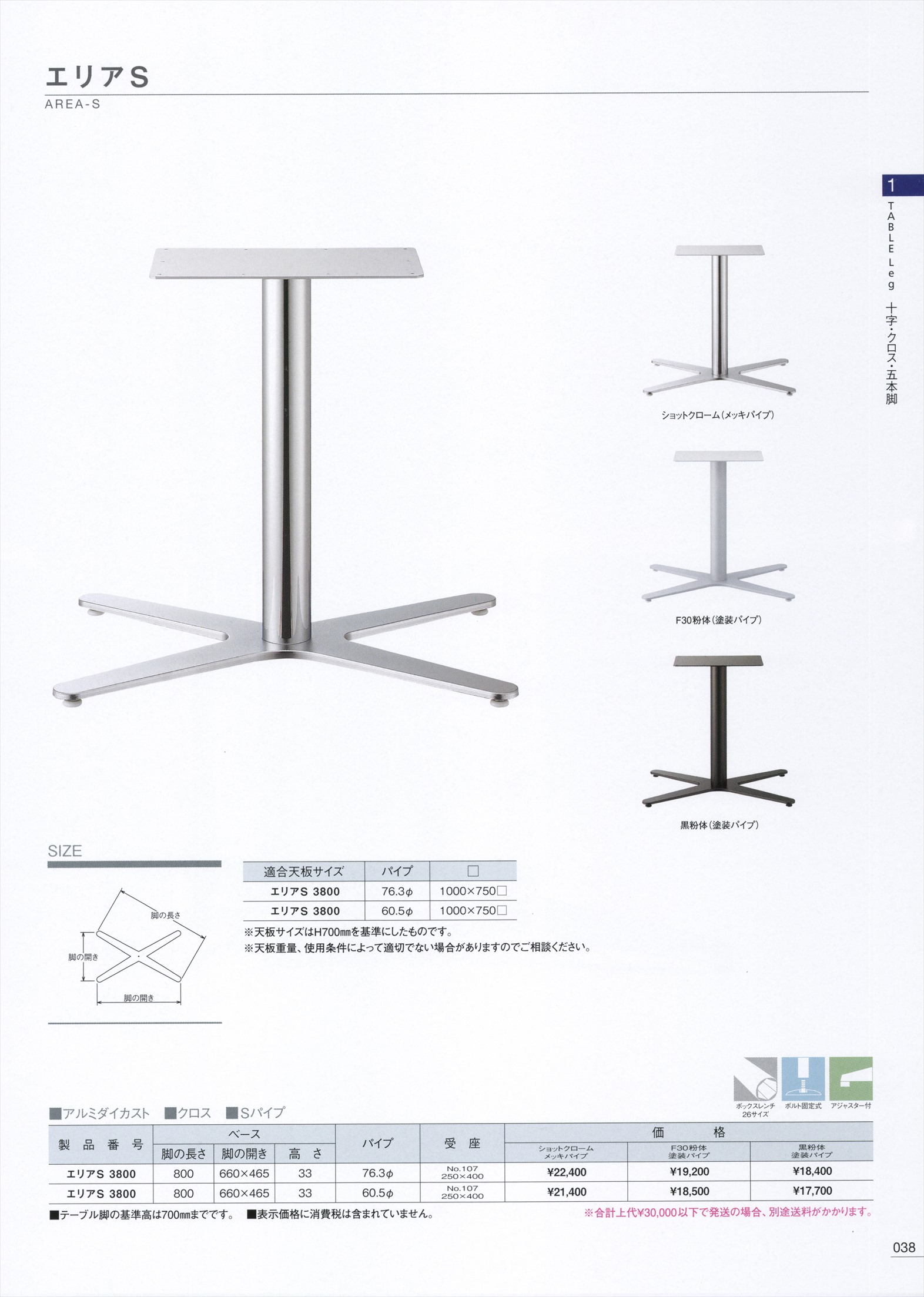 エリアS3800 パイプ76,3φ 適合天板サイズ1000×750